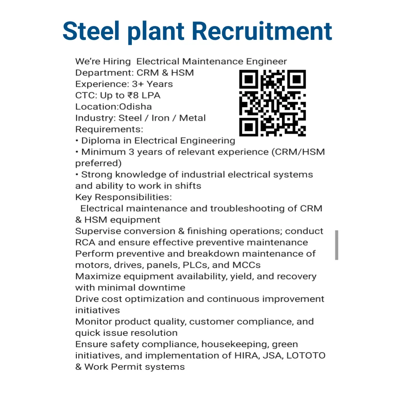 | Sponge Iron / DRI | Electrical | Assistant Manager | 1 | BE / Diploma (Electrical) | 7β15 Years |
